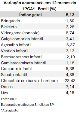 O avanço estimado reflete uma combinação de fatores. De um lado, o mercado de trabalho mantém patamar favorável, com emprego e renda real das famílias sustentando a confiança mínima para o consumo. De outro, os preços de itens relevantes para a data têm registrado variações abaixo da inflação oficial do país. Nos últimos 12 meses até agosto, o IPCA acumulou alta de 5,13%, enquanto os brinquedos subiram apenas 1,5%. Bicicletas, livros e a maior parte das peças de vestuário infantil também avançaram abaixo da média geral.