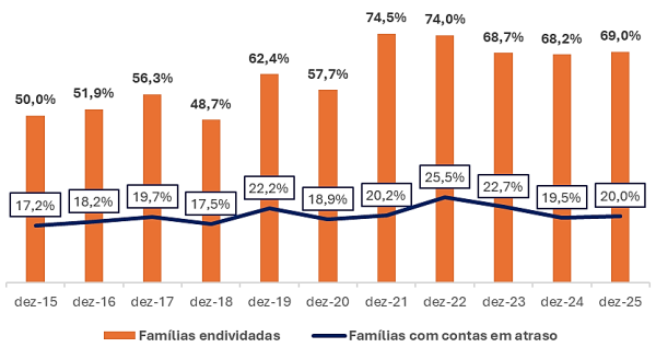 Em relação aos inadimplentes, ou seja, consumidores com dívidas já em atraso, o nível foi de 20% em dezembro de 2025, 0,5 pontos percentuais a mais que visto um ano antes, ainda que abaixo do que havia sido registrado em dezembro de 2023, quando eram 22,7%.