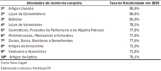 Além dos preocupantes dados gerais acima apresentados, o Sindilojas-SP aplicou uma lupa sobre os 75 subsetores do comércio varejista da capital paulista, que em 2025 empregaram um total de mais de 611 mil trabalhadores com carteira assinada. Assim, chegou-se aos 10 que possuíram as maiores taxas de rotatividade de empregados ano passado.