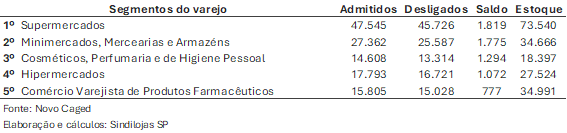 Três das cinco atividades varejistas com maior saldo absolutos de vagas ano passado comercializam gêneros alimentícios, isto é, os supermercados, os minimercados mercearias e armazéns e os hipermercados. Completam o “top 5” os estabelecimentos que vendem cosméticos, perfumaria e itens de higiene pessoal e as farmácias.