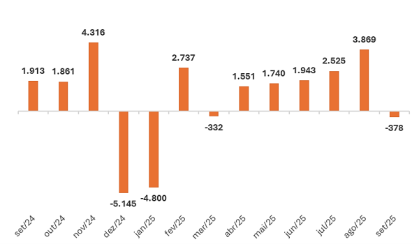 Para este último resultado, foram registradas 31.867 admissões contra 32.245 desligamentos de funcionários. Tudo isso, para um total de 610,8 mil pessoas empregadas com carteira assinada neste último mês de setembro.