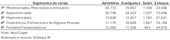 Esse resultado proveio em setembro especialmente de segmentos que tem liderado a geração de vagas no decorrer de 2025, os hipermercados e supermercados, o que demonstra certa acomodação do ritmo de crescimento de empregabilidade.