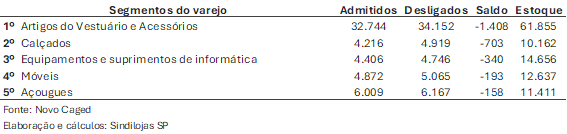 Em contraposição, os ramos com maiores retrações absolutas de empregabilidade no ano continuam sendo dos estabelecimentos de vestuário e acessórios (-1.408 vagas) e os que comercializam calçados (-703 vagas).