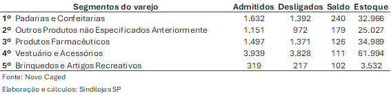 As padarias paulistanas lideraram dentre os resultados dos 75 segmentos que formam o varejo da Capital, com +240 empregos em outubro de 2025. A elas se seguiram o varejo de outros produtos não especificados, as farmácias, o varejo de vestuário e os estabelecimentos que comercializam brinquedos.
