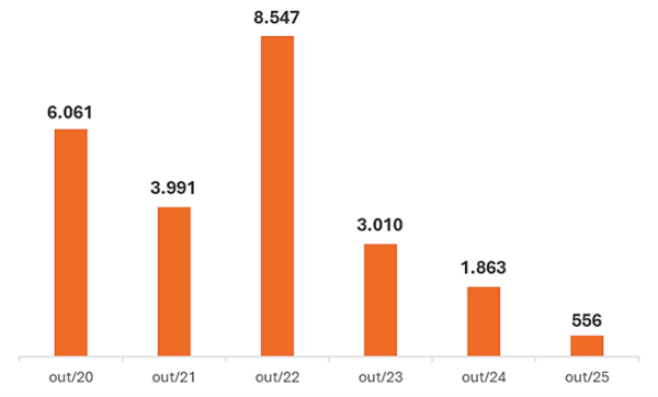Este último saldo positivo até se opõe a perda de 303 vagas de setembro, porém, como poderá ser mais bem observado abaixo, em relação a outros anos, tivemos em 2025 o resultado mais fraco na geração de empregos com carteira assinada no comércio varejista da Capital para um mês de outubro, com queda, por exemplo, de 70% em relação a geração vista no mesmo mês de 2024.